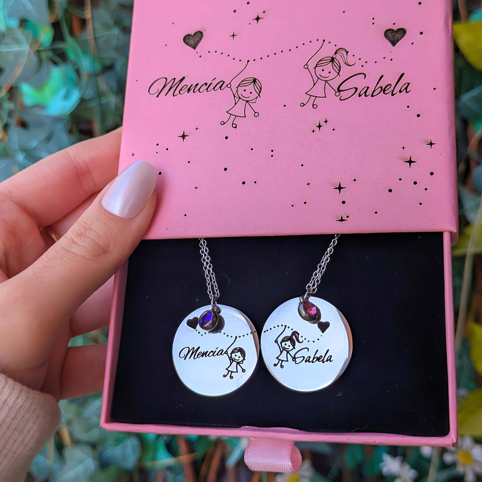 🔹 Personaliza los nombres de cada muñeca para que el colgante cuente vuestra historia real.