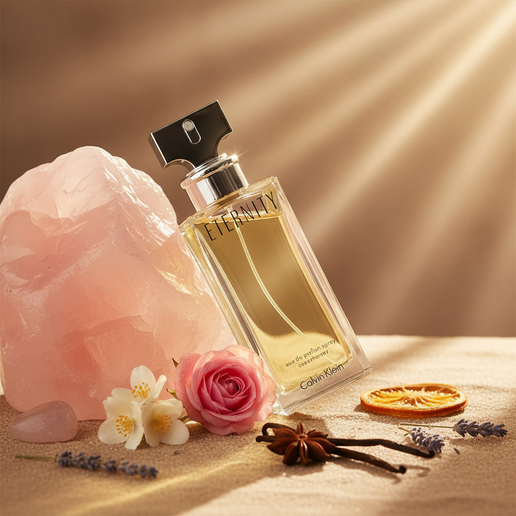 CK Eternity for Women Eau de Toilette de Calvin Klein es una fragancia floral clásica y atemporal, inspirada en el ideal del amor eterno y el compromiso. Se caracteriza por ser un aroma romántico, limpio y sofisticado. Sus notas de salida son frescas y vibrantes, combinando cítricos, mandarina y notas verdes. El corazón es un opulento y delicado ramo floral donde destacan el lirio de los valles (muguete), el clavel, la rosa y el jazmín. Finalmente, la fragancia se asienta en una base cálida y suave de sándalo, ámbar y almizcle, dejando una estela elegante y duradera. Es ideal para la mujer que valora la sencillez, el romanticismo y la elegancia clásica, siendo perfecta para el uso diario, especialmente en climas cálidos.